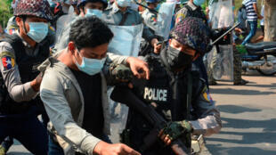 Members of myanmar's security forces on a street in taunggyi in shan state, during a crackdown on protests against the military coup.